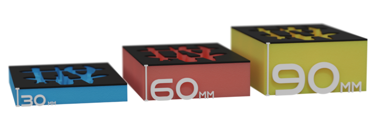 We stock material with a 3mm to 5mm black top layer and a colored bottom layer: Blue, Red, Green, Yellow, and Grey. These combinations are stocked in 30mm, 60mm and 90mm thickness